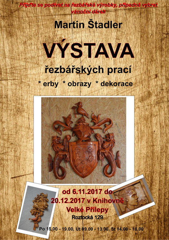 Přijďte se podívat na řezbářské výrobky, případně vybrat vánoční dárek. Erby, obrazy, dekorace. od 6.11.2017 do 20.12.2017 v Knihovně Velké Přílepy